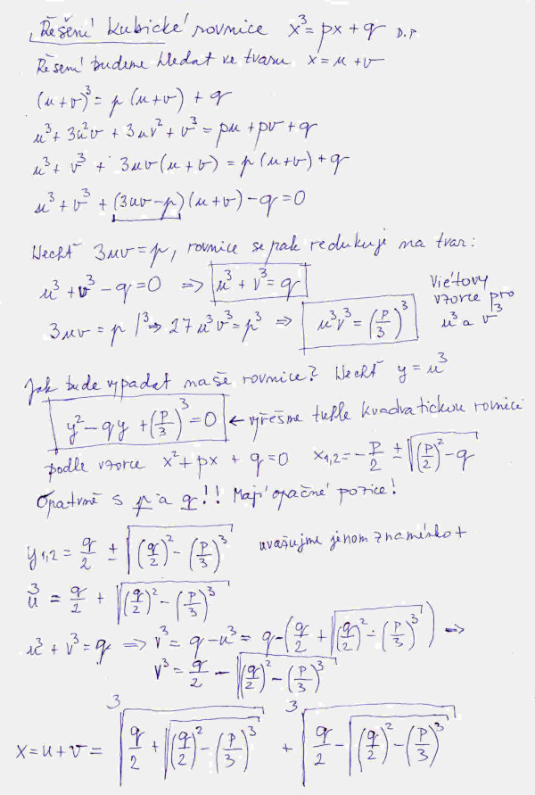 Že nejvíc popularizační literatury vychází z matematiky je nasnadě. Píše se o ní nejsnáze. Pak je to již jenom otázka kvality toho kterého titulu. Nedávno se mi dostal zcela náhodou do ruky útlý titul Duch matematiky od Davida Achesona [1]. Knihu jsem prolistoval a zastavil se u kapitoly č. 26 s názvem Druhá odmocnina z minus jedné. V kapitole je zmíněn výsledný Cardanův vzorec pro obecné řešení kubické rovnice. Jak se k němu lze dopracovat je velice stručně uvedeno v poznámce na straně 169 a 170. Podle mě výpočet není až tak triviální, aby se odbyl tak stručnou poznámkou. A tak mi to nedalo, a řekl jsem si, že ten výpočet dám v souladu s doporučením v knize na papír, tedy ne zcela matematicky přesně, ale spíš populárně. Pokud stojíte o přesný výklad doporučuji kvalitní a komplexní titul [2].